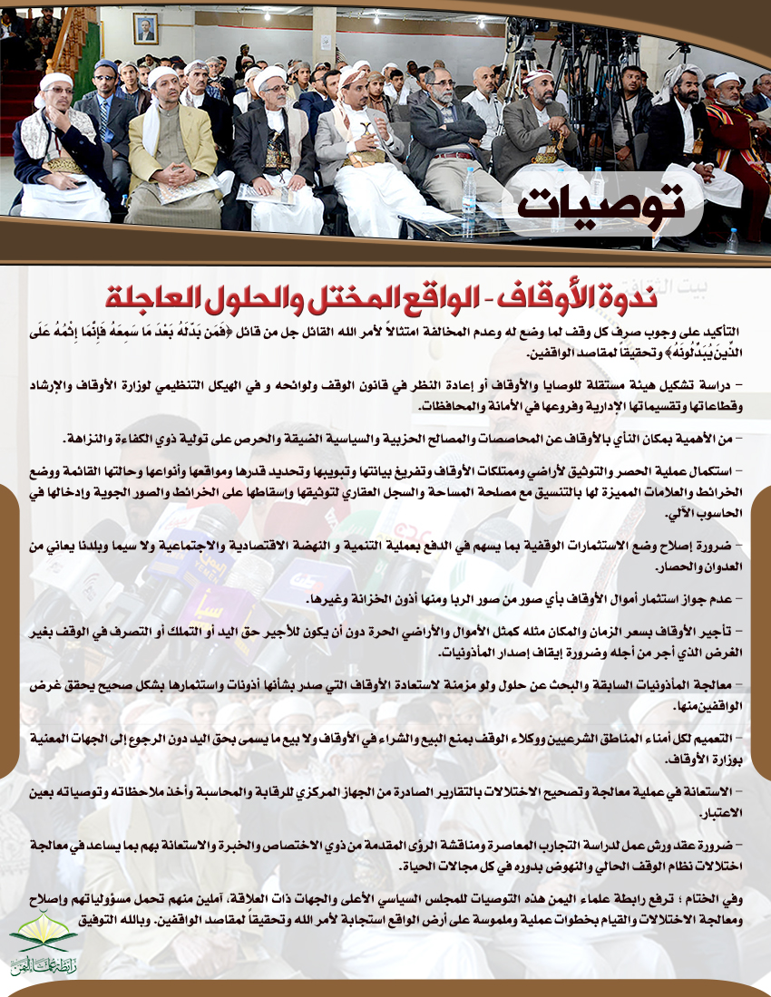 وفي الختام ؛ ترفع رابطة علماء اليمن هذه التوصيات للمجلس السياسي الأعلى والجهات ذات العلاقة، آملين منهم تحمل مسؤولياتهم وإصلاح ومعالجة الاختلالات والقيام بخطوات عملية وملموسة على أرض الواقع استجابة لأمر الله وتحقيقاً لمقاصد الواقفين. وبالله التوفيق